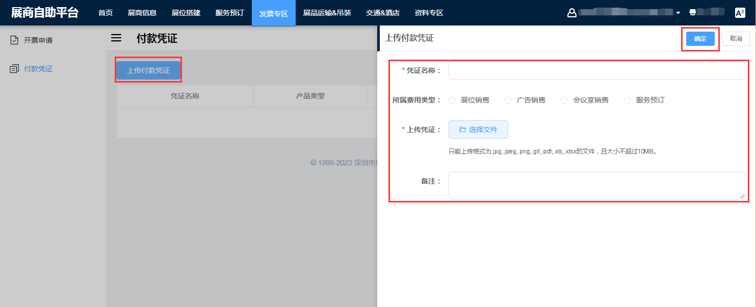 点击 发票专区 > 付款凭证 ,点击左上角 上传付款凭证 ,将会从右侧弹出上传详情页,按提示填入相关信息即可。