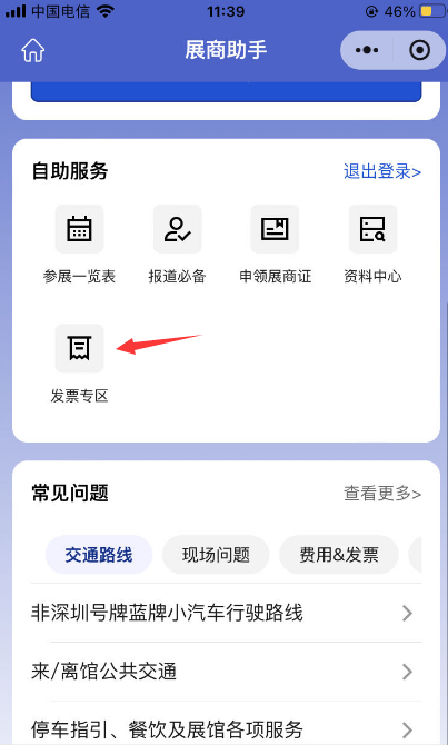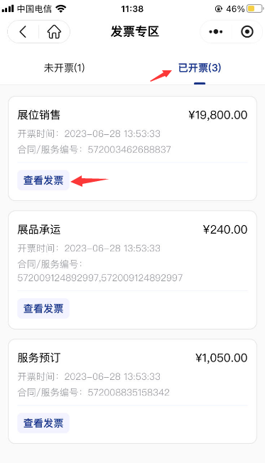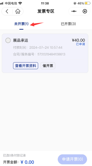 - 开通展商账号后,手机微信扫码打开「 易展通 」小程序,,展商登录自助服务,进入发票专区可申请和查看所有的 **付款记录对应的开票信息 ** 。