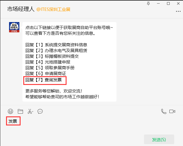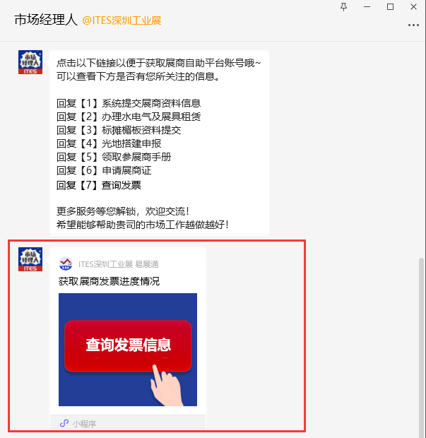 - 微信添加「 市场经理人 」,输入“ 发票 ”或对应数字,再点击卡片链接可登录易展通后进入 发票专区 。