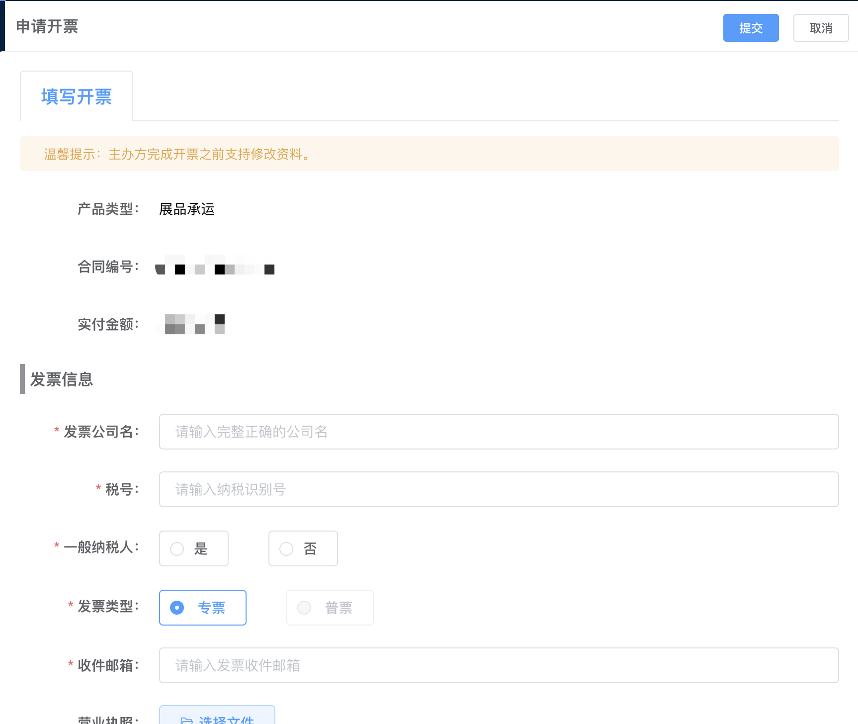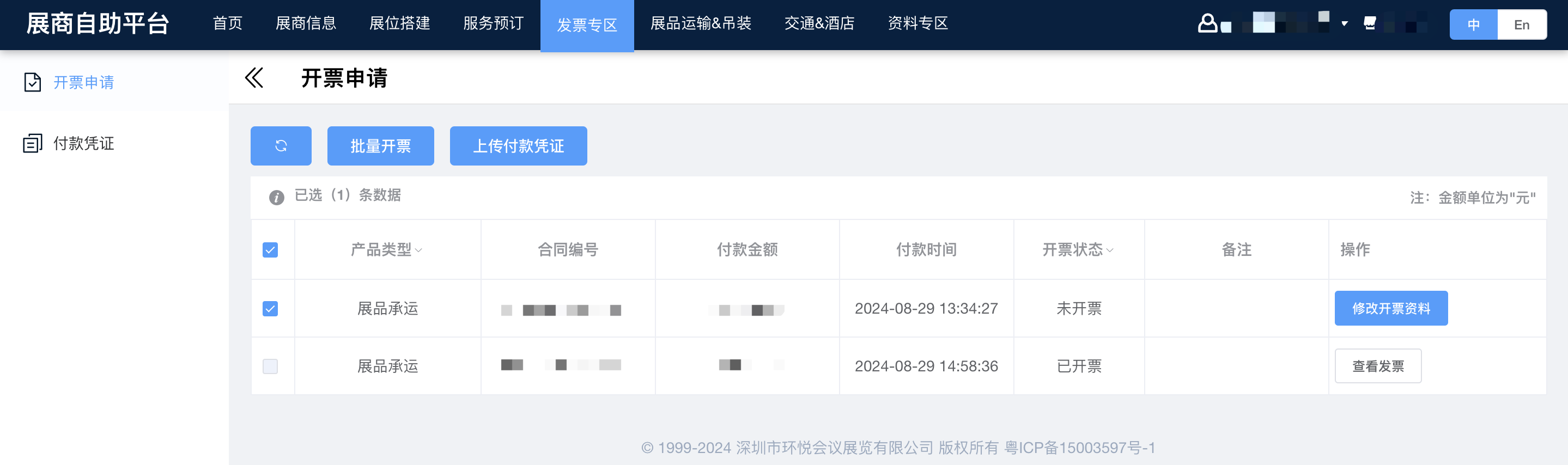点击 发票专区 > 开票申请 ,勾选所在开发票的付款项目,点击 批量开票 ,将会从右侧弹出申请表单页,按提示填入相关信息后提交即可。