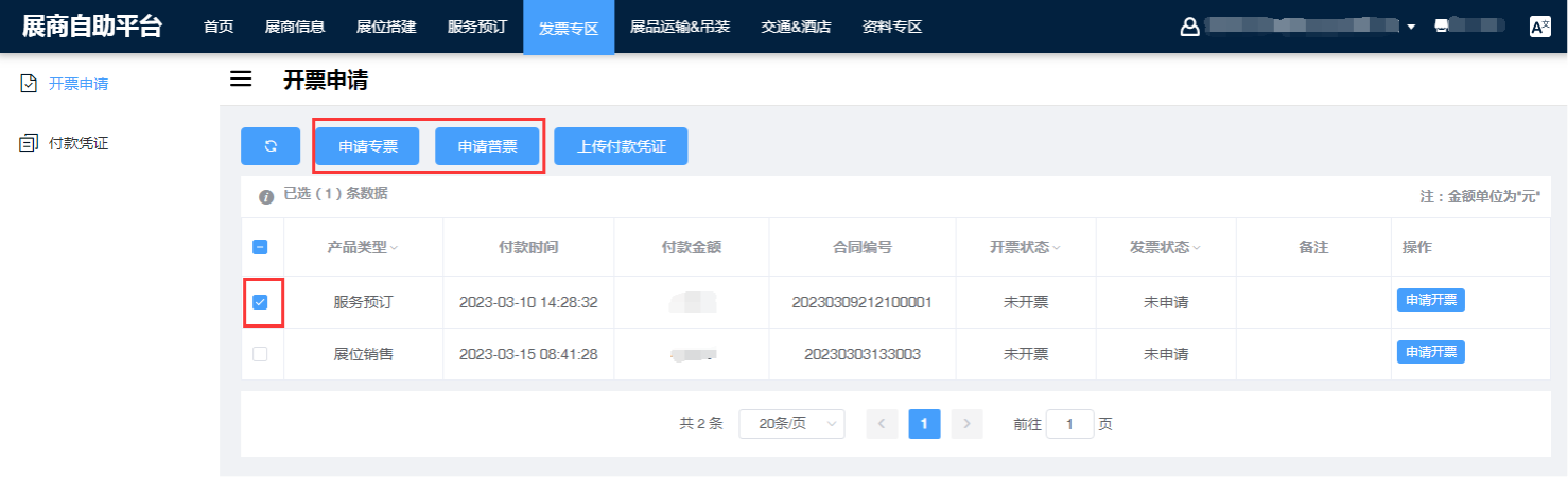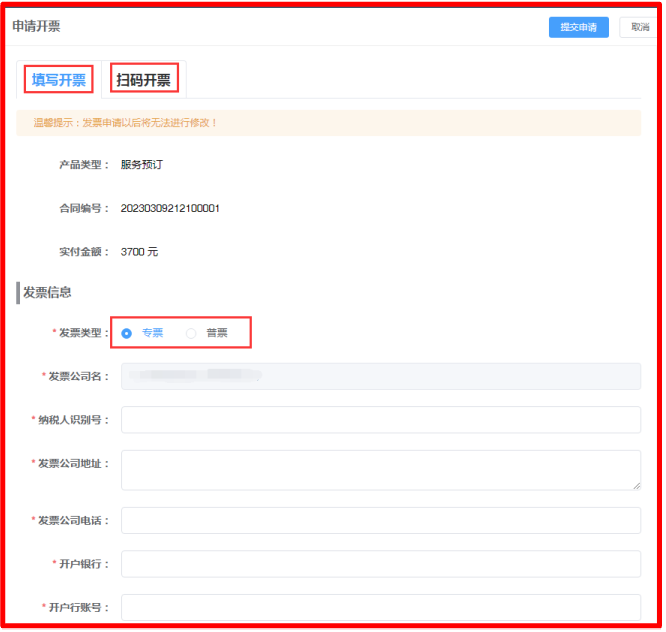 点击 发票专区 > 开票申请 ,勾选所在开发票的付款项目,点击 申请专票 ,将会从右侧弹出申请表单页,按提示填入相关信息即可,同时点击上面 扫码开票 还支持手机微信扫码开票。