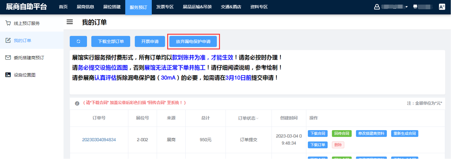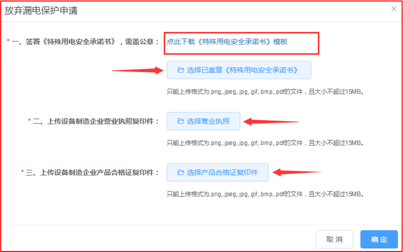 点击菜单 服务预订 > 我的订单 > 放弃漏电保护申报 ,点击 放弃漏电保护申报 按钮 将弹出上传文件面板,然后上传盖公章后的《特殊用电安全承诺书》、营业执照及产品合格证复印件,再点击 确定 按钮提交即可。